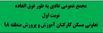 به اطلاع کلیه اعضا محترم شرکت تعاونی مسکن کارکنان آموزش و پرورش منطقه 18 تهران می رساند که جلسه ی مجمع عمومی عادی به طور فوق العاده نوبت اول روز چهارشنبه مورخه 28/8/1404 راس ساعت 10 صبح در محل دفتر تعاونی مسکن واقع در بزرگراه آیت اله سعیدی بلوار معلم میدان معلم بلوار مدائن پلاک6 واحد1 تشکیل می گردد ، حضور به هم رسانند .